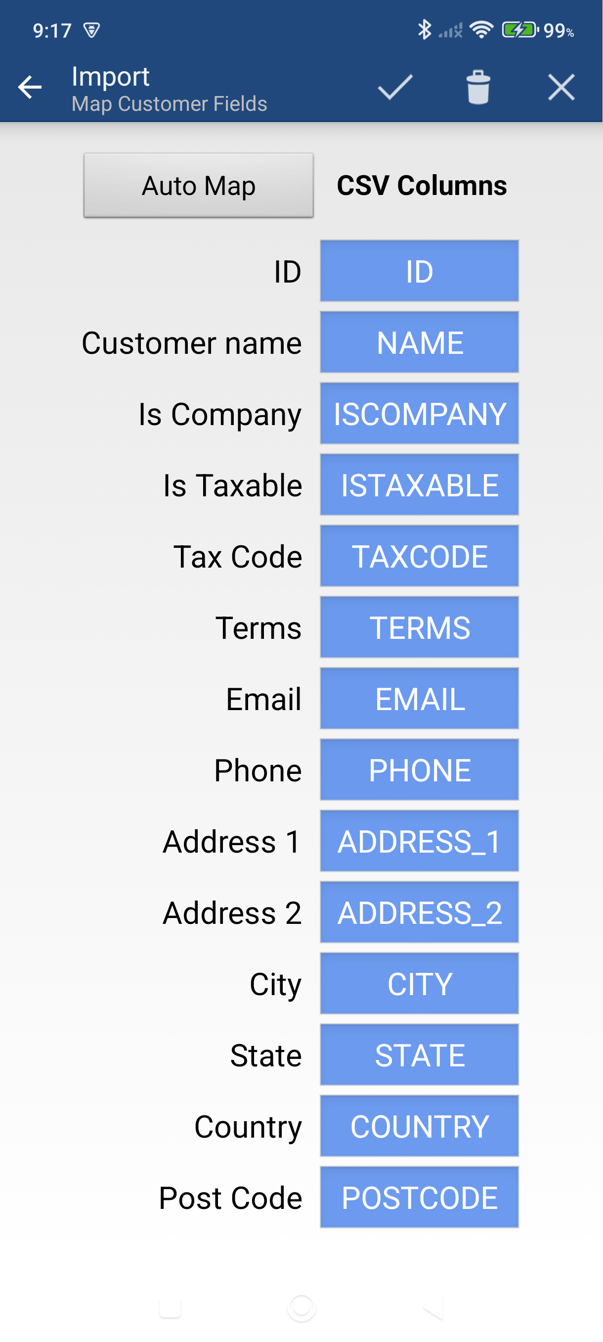 Tap Map Fields. Assign each MobileBiz field to the matching column in your CSV. Tap Auto Map to let the app match columns automatically — works best when your headers use standard names like NAME, PRICE, or DESCRIPTION.